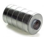 SLU lyddæmper diameter ø 100, længde 300 mm er opbygget af en ydre kappe af spiralfalset rør og et indvendigt, perforeret rør. Mellemrummet er fyldt med mineraluld. For at undgå medrivning af mineraluld, er der anbragt en polyesterdug mellem den perforerede plade og mineralulden.